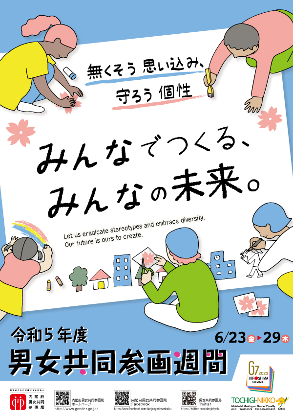 男女共同参画社会の実現に向けて、男女共同参画社会基本法という法律が施行されたのが、1999年(平成11年)6月23日です。これを機に、毎年6月23日から29日の1週間を男女共同参画週間とし、全国で様々な取り組みを行い普及啓発に努めています。