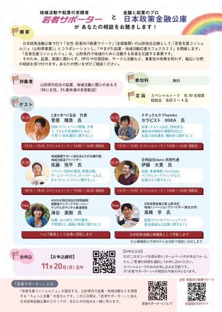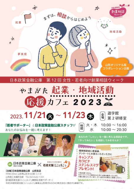 日本政策金融公庫山形支店主催のやまがた起業・地域活動応援カフェ2023に、若者支援コンシェルジュの若者サポーターがゲスト出演します。開催期間中6名のサポーターが地域活動に関するトークショーや相談会を開催。気になるサポーターの話を聞いて相談会で地域活動に関する相談もできる機会です!是非ご参加ください。