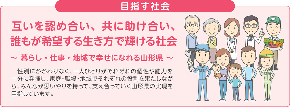 このたび、県における男女共同参画と女性の職業生活における活躍を推進する指針として、新たな「山形県男女共同参画計画」を策定しました。みんなで連携・協力し、誰もが活躍できる山形県を創っていきましょう。
